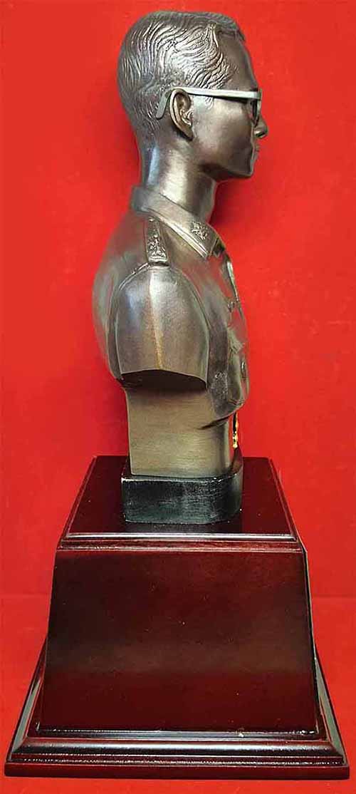 ขอเชิญท่านพบกับพระบรมรูปพระบาทสมเด็จพระปรมินทรมหาภูมิพลอดุลยเดชมหาราชพระเจ้าอยู่หัว รัชกาลที่ ๙ แห่งบรมราชจักรีวงศ์ พระราชทานพระบรมราชานุญาตให้จัดสร้างในการฉลองมหามงคลสมัยเสด็จดำรงสิริราชสมบัติครบ 50 ปี กาญจนาภิเษกแห่งพระบาทสมเด็จพระเจ้าอยู่หัวรัชกาลที่ 9 เมื่อวันที่ 9 มิถุนายน พ.ศ.2539 ทรงพระราชทานพระบรมราชานุญาติให้กรมราชองครักษ์จัดสร้างพระบรมรูปรัชกาลที่ 9 ขึ้นจำนวน 10,000 องค์(น้อยมาก ๆ ครับ) ยิ่งถ้าเป็นแบบฐานสูงจะมีเพียงจำนวน 500 องค์เท่านั้นครับผมโดยการออกแบบของท่านอาจารย์ไข่มุกด์ ชูโต ประติมากรหญิงคนแรกของประเทศไทย ด้านหลังมีโค๊ต ข.ช. หมายถึงผู้ออกแบบ คือ ท่านอาจารย์ไข่มุกด์ ชูโต ศิลปินแห่งชาติสาขาประติมากรรมนั้นเองครับ พระบรมรูปฯ ครึ่งพระองค์ตามสไตล์ตะวันตก ทรงชุดมหาดเล็กเต็มพระยศมีความสง่างาม ที่สุดแห่งปราณีตศิลป์ และความสวยงามทรงคุณค่ายิ่งอันหาไม่ได้อีกแล้วครับท่าน เนื้อโลหะทองเหลืองรมมันปู(สีน้ำตาล) การจัดสร้างจะมีใบประกาศนียบัตรพระราชทานระบุหมายเลขประจำองค์ ปั๊มตรานูนกรมองครักษ์ป้องกันการปลอมแปลงครับ