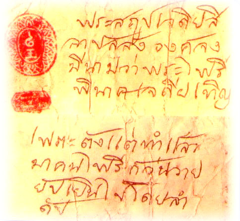 นะมัสสะ พระพุทธะไพรีพินาศายะ มาราปะราชะยัง นะมามิหัง พุทธังวันทามิ ธัมมังวันทามิ สังฆังวันทามิ สัพพะโส