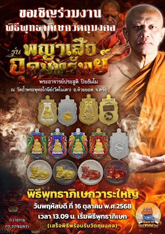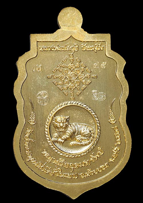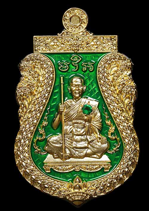 เหรียญเสมาพญาเสืออุดมทรัพย์ พระอาจารย์ประสูติ (หลวงพ่อประสูติ) วัดในเตา ตรัง เนื้อชุบทอง ลงยาเขียว ฝังพลอยเขียวสังฆาฏิ 1 เม็ด หมายเลข 75 พร้อมกล่องเดิม