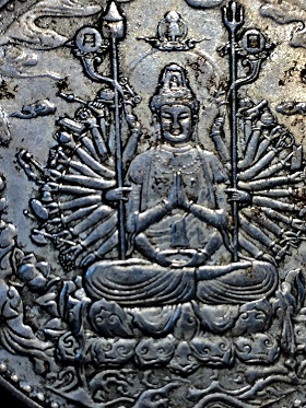 เหรียญใหญ่เจ้าแม่กวนอิมปางพันมือหลังอักขระพระสูตรอักษรจีน เนื้อเงินผสม วัดมังกรกมลาวาส กทม.