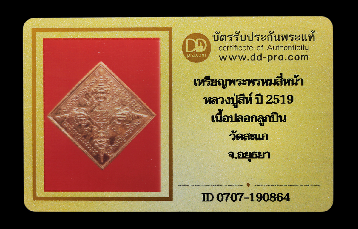 เหรียญพระพรหมสี่หน้า หลวงปู่สีห์ ปี2519 เนื้อปลอกลูกปืน วัดสะแก จ.อยุธยา พร้อมบัตรับประกันพระแท้ DD-PRA.COM +++