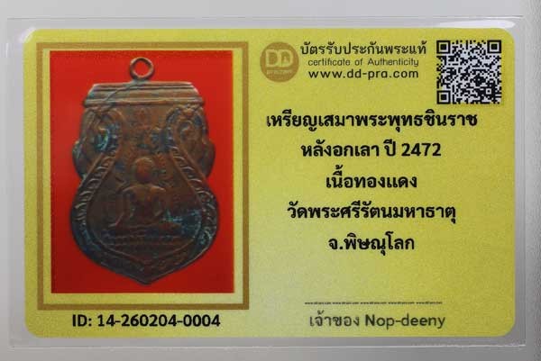 200....เหรียญพระพุทธชินราช หลังอกเลา พิมพ์เสมา เนื้อทองแดง ปี 2472 (มีบัตร) วัดพระศรีฯ จ.พิษณุโลก