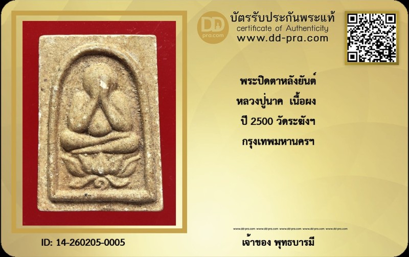 หลวงปู่นาค พระปิดตาหลังยันต์ เนื้อผง ปี 2500 วัดระฆังฯ + บัตรรับรอง