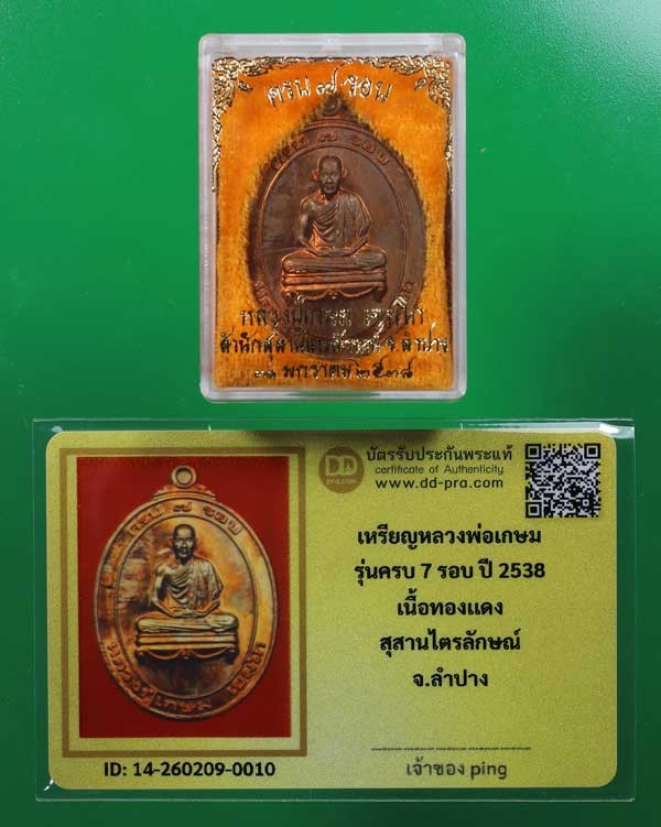 วัดใจ *-* เหรียญหลวงพ่อเกษม รุ่น 7 รอบ ปี2538 เนื้อทองแดง (แชมป์) กล่องเดิม + บัตร