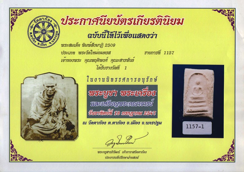 สมเด็จบางขุนพรหม 09 พิมพ์สังฆาฏิ หลังตรายาง พร้อมใบประกาศที่ 1 วัดใหม่อมตรส กทม. ที่สร้างเพื่อหารายได้สร้างพระอุโบสถหลังใหม่