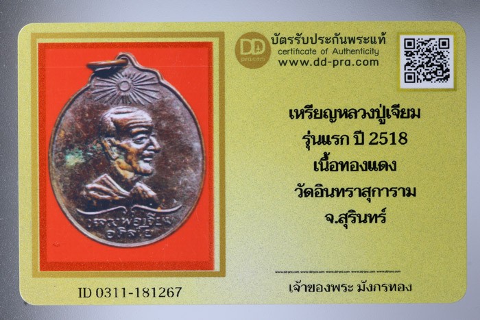 เหรียญรุ่นแรกหลวงปู่เจียม อติสโย วัดอินทราสุการาม จ.สุรินทร์ ปี ๒๕๑๘ + บัตรดีดี
