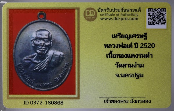 แชมป์ เหรียญเศรษฐีพิเศษ หลวงพ่อเต๋ คงทอง วัดสามง่าม จ.นครปฐม ปี 2520 เนื้อทองแดง + บัตรดีดี