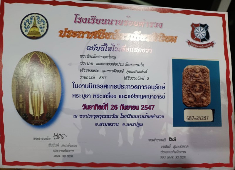 หลวงพ่อปาน วัดบางนมโค พิมพ์ขี่ครุฑใหญ่ พิมพ์ตื้น บล็อคแตก นิยม + ใบประกาศที่ 2 งานสามพราน 26 ก.ย. 2547