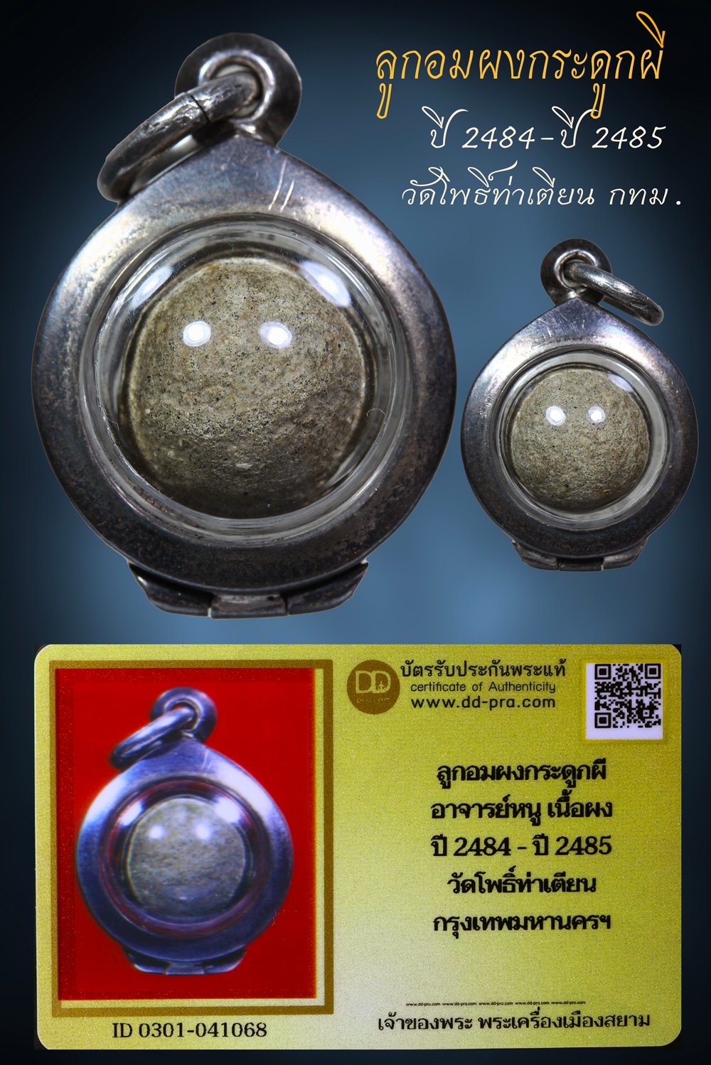ลูกอมผงกระดูผี ปี 2485 วัดโพธิ์ท่าเตียน กทม. (เลี่ยมตลับเงิน)บัตรรับประกันพระแท้ ดีดีพระ // ตัวจริง ทันแท้ดูง่าย