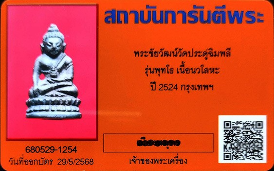 พระชัยวัฒน์หลวงปู่โต๊ะ วัดประดู่ฉิมพลี รุ่นพุทโธ เนื้อนวโลหะ ปี 2524 กรุงเทพฯ พร้อมบัตรG...090-9870009