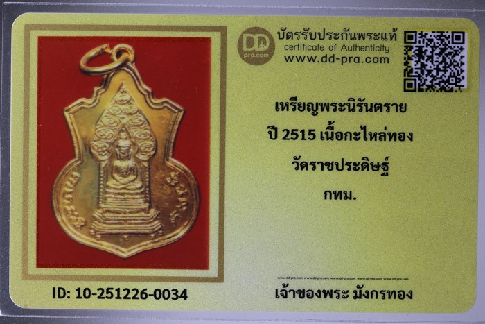 เหรียญเสมานิรันตราย(เจริญลาภ) มปร. วัดราชประดิษฐ์ ปี 2515 เนื้อทองแดงกะไหล่ทอง พิธีใหญ่ หลวงปู่ทิมร่วมปลุกเสก มีขนาดสูง 3.2 x 2.3 ซ.ม. โดยสร้างขึ้นเมื่อ พ.ศ. 2515 เพื่อสมโภชครบ 108 ปี วัดราชประดิษฐ์ฯ ซึ่งเป็นพระอารามหลวงชั้นเอก โดยขอพระราชทานพระมหากรุณาธิคุณอยู่ในพระบรมราชูปถัมภ์พร้อมเสด็จฯ เป็นองค์ประธานในพิธีนี้ด้วย พระบาทสมเด็จพระเจ้าอยู่หัวภูมิพลอดุลยเดชมหาราช เสด็จฯ ทรงเททองหล่อ “พระนิรันตรายจำลอง” (ขนาดบูชา) เมื่อวันที่ 10 มีนาคม พ.ศ. 2515 จำนวน 908 องค์ ตามจำนวนการสั่งจองของประชาชนโดยทั่วไป จากนั้นนำทองชนวนที่เหลือจาก พระบาทสมเด็จพระเจ้าอยู่หัวฯ ทรงเททองหล่อพระนิรันตรายจำลองดังกล่าวไปจัดสร้าง “พระกริ่งนิรันตราย” ทั้งพิมพ์ใหญ่และพิมพ์เล็ก, พระกริ่งโสฬส ม.ป.ร. และเหรียญพระนิรันตรายแบบพัดยศและแบบเสมา โดยได้มีการจัดพุทธาภิเษก ในพระอุโบสถวัดราชประดิษฐ์สถิตมหาสีมารามเป็นเวลา 9 วัน 9 คืน ตั้งแต่วันที่ 16-24 พฤศจิกายน 2515 โดยได้นำชนวนมาจาก การเททองหล่อพระนิรันตรายรุ่นแรก ซึ่งพระบาทสมเด็จพระเจ้าอยู่หัวทรงเสด็จเททอง