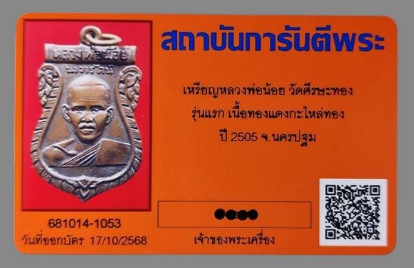 เหรียญหลวงพ่อน้อย วัดศรีษะทอง รุ่นแรก ปี 2505 เนื้อทองแดงกะไหล่ทอง จ.นครปฐม จาร์หน้า 4 หลัง 4 ครับ มาพร้อมบัตรรับรองครับ....090-9870009