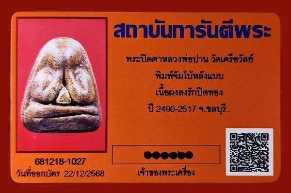 พระปิดตาหลวงพ่อปาน วัดเครือวัลย์ พิมพ์จัมโบ้หลังแบบ เนื้อผงลงรักปิดทอง ปี 2490-2517 จ.ชลบุรี พร้อมบัตรG....090-98700009