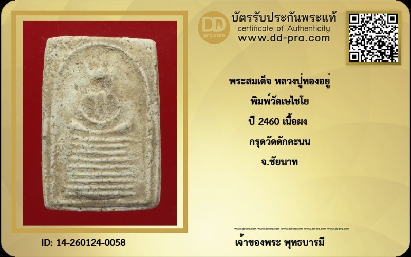 หลวงปู่ทองอยู่ พิมพ์วัดเษไชโย กรุดวัดดักคะนน ปี 2460 เนื้อผง + บัตรรับรอง
