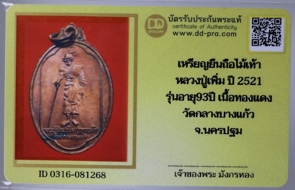 เหรียญถือไม้เท้าแบบทำบุญฉลองคล้ายวันเกิด อายุ 93 ปี หลวงปู่เพิ่ม วัดกลางบางแก้ว ปี 2521 + บัตรดีดี