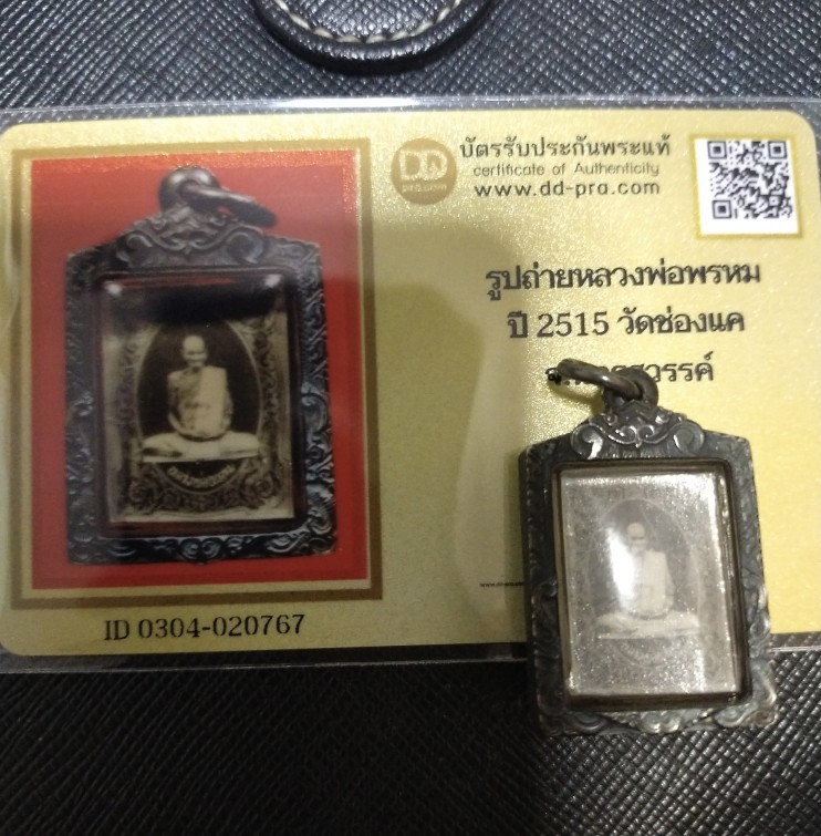 3500.-รูปถ่ายแจกทานเข่าทะลุซุ้ม หลังเรียบ หลวงพ่อพรหม วัดช่องแค ปี15 เลี่ยมเงิน+บัตรดีดี
