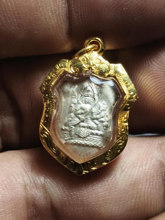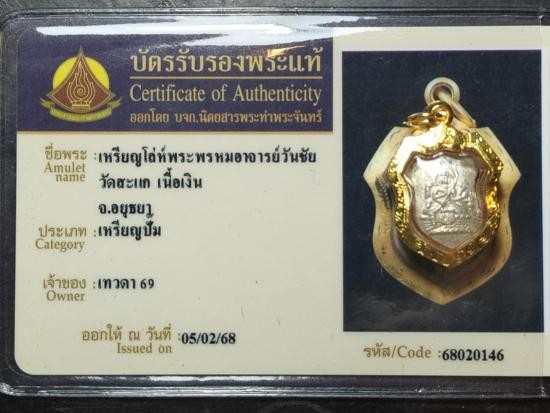 เหรียญโล่จิ๋วพระพรหมอ.วันชัยหลวงปู่สีปลุกเสก วัดสะแก เนื้อเงินมีจารด้านหลัง พร้อมบัตรรับรอง และกรอบทองคำแท้ 80%