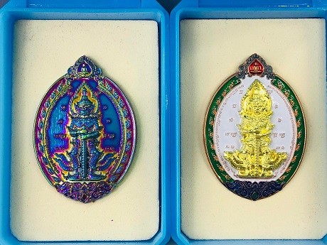 เคาะเดียว 2 เหรียญ ท้าวเวสสุวรรณ เศรษฐีทวีทรัพย์ ซูตองเป้ หลวงพ่อช้าง พิมพ์ใหญ่ เนื้อไทเทเนียมผิวรุ้ง เลข 1300 + เนื้อทองแดงผิวไฟหน้ากากทองทิพย์ ลงยาขาว เลข 145 พร้อมกล่องเดิม
