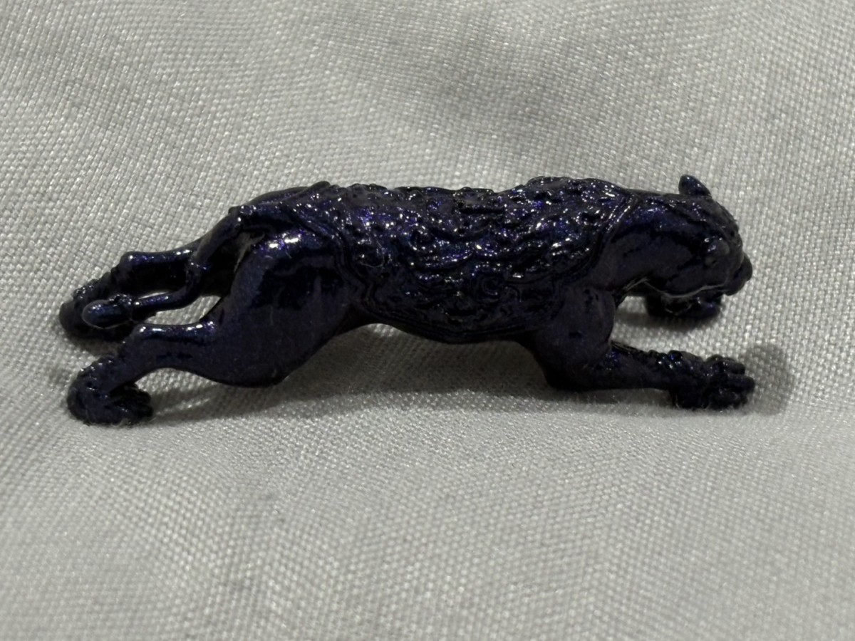 รูปหล่อเสือ รุ่น เจ้าพระยาเสือดำ หลวงปู่บุญมา โชติธมโม สำนักสงฆ์เขาแก้วทอง จ.ปราจีนบุรี ปี 2565 ขนาด 4 ซม เนื้อเหลือบม่วงประกายมุข หมายเลข 45 พร้อมกล่องเดิม