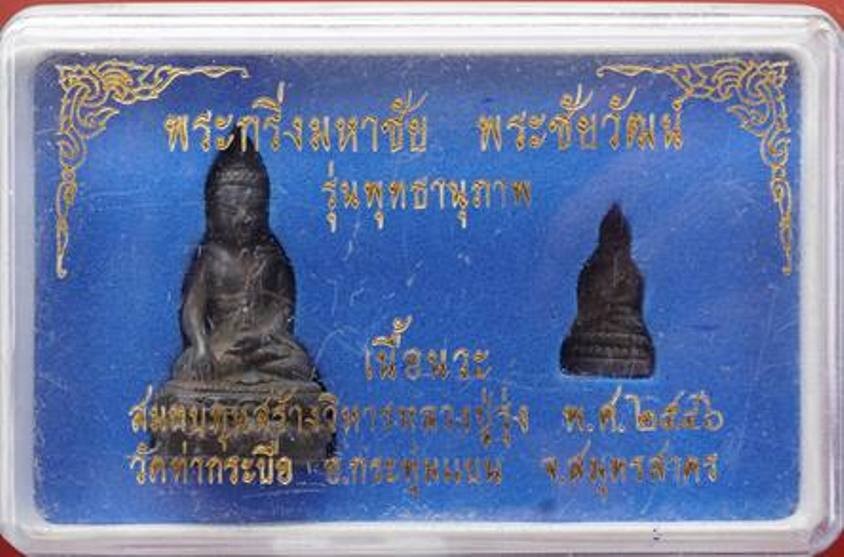 1200.-พระกริ่งมหาชัย+พระชัยวัฒน์ หลวงพ่อรุ่งวัดท่ากระบือ จ.สมุทรสาคร ปี 46 เลข677 เนื้อนวะพร้อมกล่อง