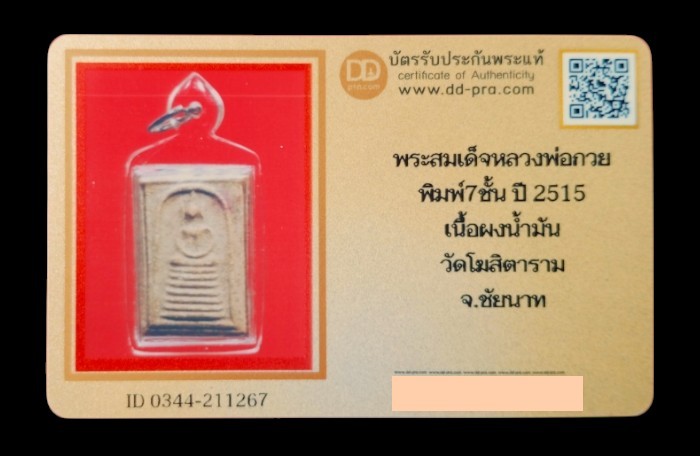 พระสมเด็จ  พิมพ์ 7 ชั้น หลวงพ่อกวย วัดโฆสิตาราม ชัยนาท  เนื้อผงน้ำมัน ปี 2515 (เลี่ยมโบราณ)