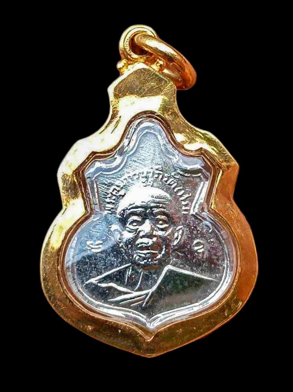 เหรียญคอน้ำเต้าหลังนูน หลวงปู่ทิม วัดละหารไร่ เนื้ออัลปาก้าชุบนิเกิล พ.ศ. 2517 เลี่ยมทอง