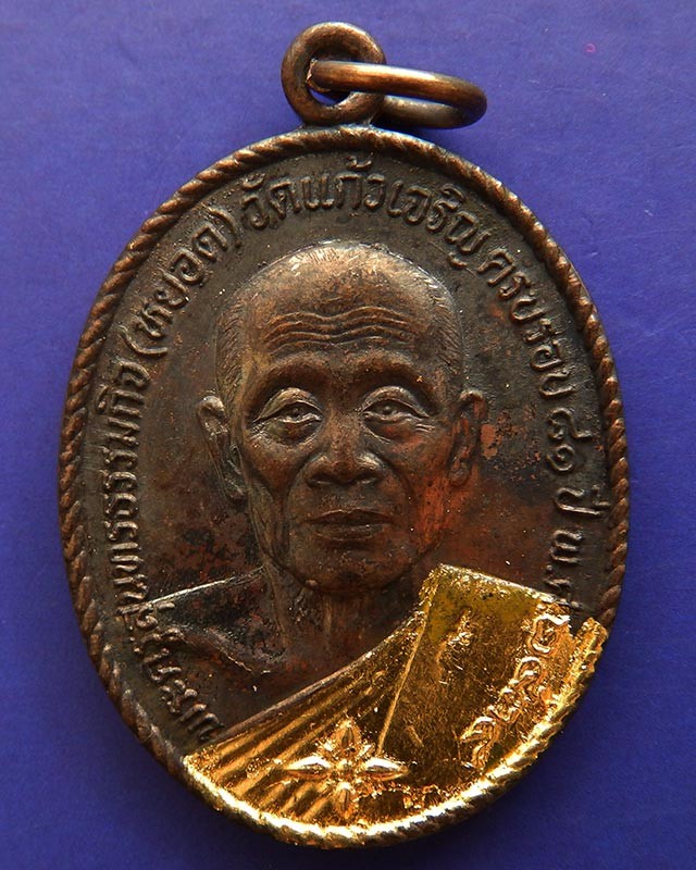 10.หลวงพ่อหยอด วัดแก้วเจริญ เหรียญรุ่นทรัพย์ล้นเหลือ(สไบทอง) ครบ 81 ปี ปิดทองและตอกโค๊ดที่สังฆาฎิ พ.ศ. 2534