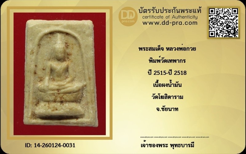 หลวงพ่อกวย วัดโฆสิตาราม (ถอดพิมพ์วัดเทพากร) ปี 2515-ปี 2518 เนื้อผงน้ำมัน + บัตรรับรอง