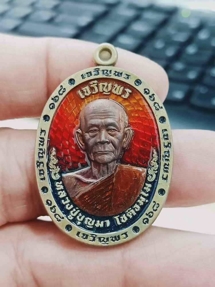 2-1508 วัดใจ 150 เหรียญเจริญพร หลวงปู่บุญมา สำนักสงฆ์เขาแก้วทอง จ.ปราจีนบุรี 2567 ทองเหลืองซาติน ลงยาไล่สี หน้าหลัง จีวร หมายเลข 95 กล่องกำมะหยี่เดิม***งานสวย
