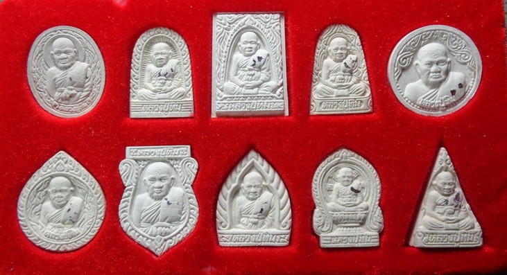 - ชุดพระผงหลวงปู่ทิม วัดพระขาว จ.อยุธยา ปี 2540 รุ่นเสาร์ ๕ เนื้อผงสีขาวโรยแร่พลอยแดงทุกองค์ พร้อมกล่องเดิมจากวัด สวยครับ