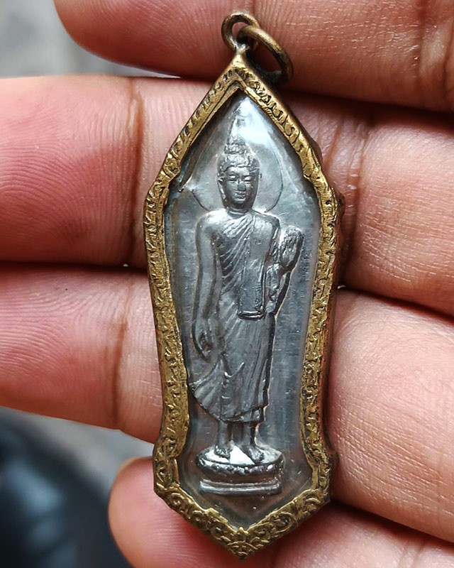 2.พระลีลา 25 พุทธศตวรรษ เนื้อชิน พิมพ์หางหงส์ มีเขี้ยว ผิวกระจก เลี่ยมกรอบธรรมจักรเดิมๆ ขาครบแข็งแรง ไม่เคยผ่านการแกะเลย