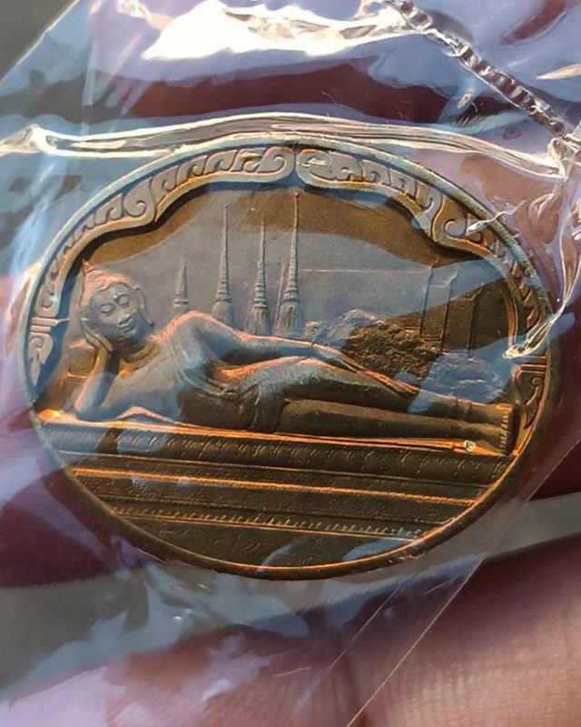 เหรียญพระนอน หลัง ภปร. พิธีใหญ่วัดโพธิ์ ฉลองในหลวงพระชนมายุครบ 5 รอบ พ.ศ. 2530 ไม่ผ่านการใช้ ซองเดิมๆ