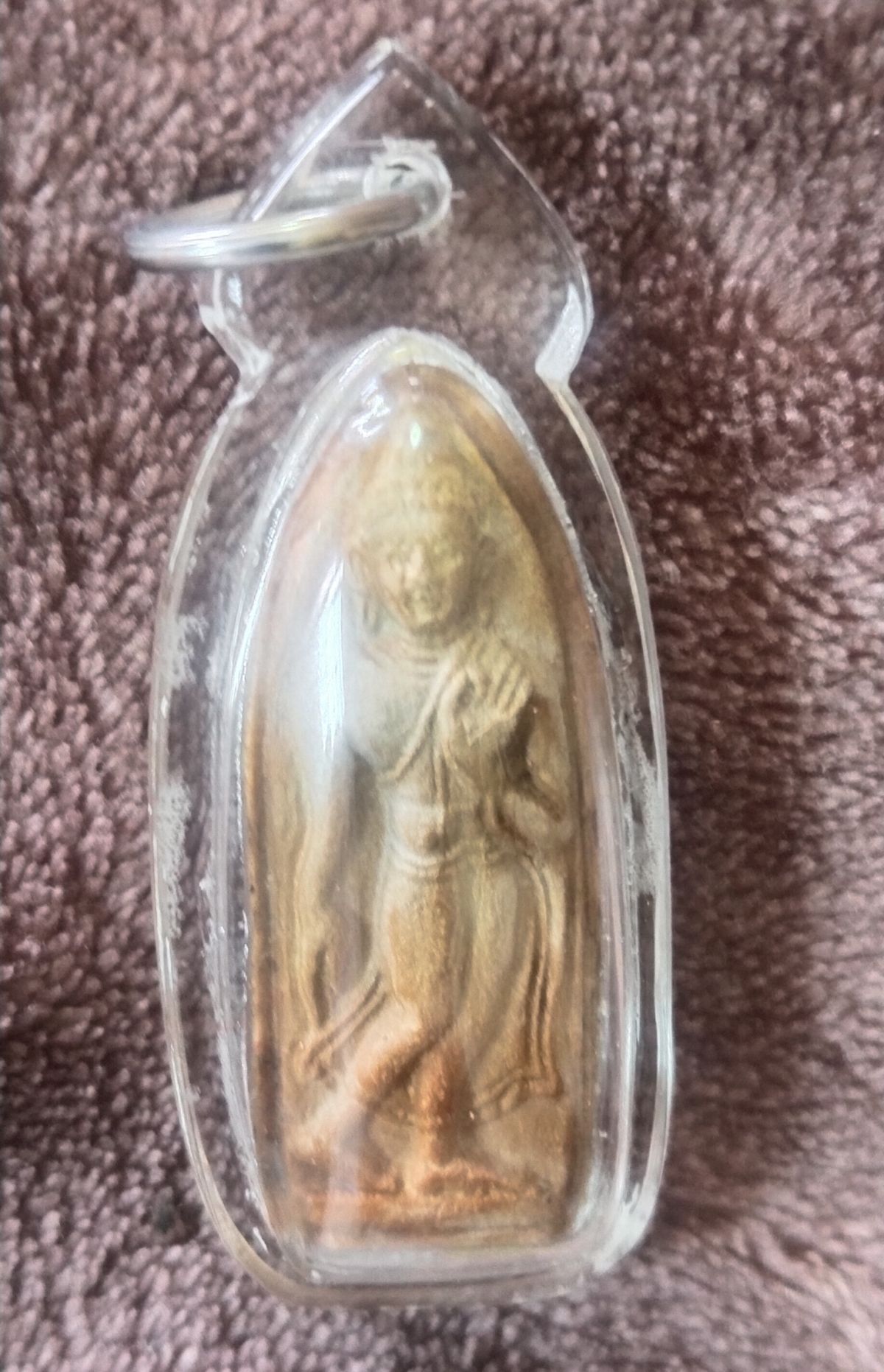ด้านหน้าเป็นพระพุทธรูปปางลีลา (ท่าเดิน) และด้านหลังมีอักขระยันต์