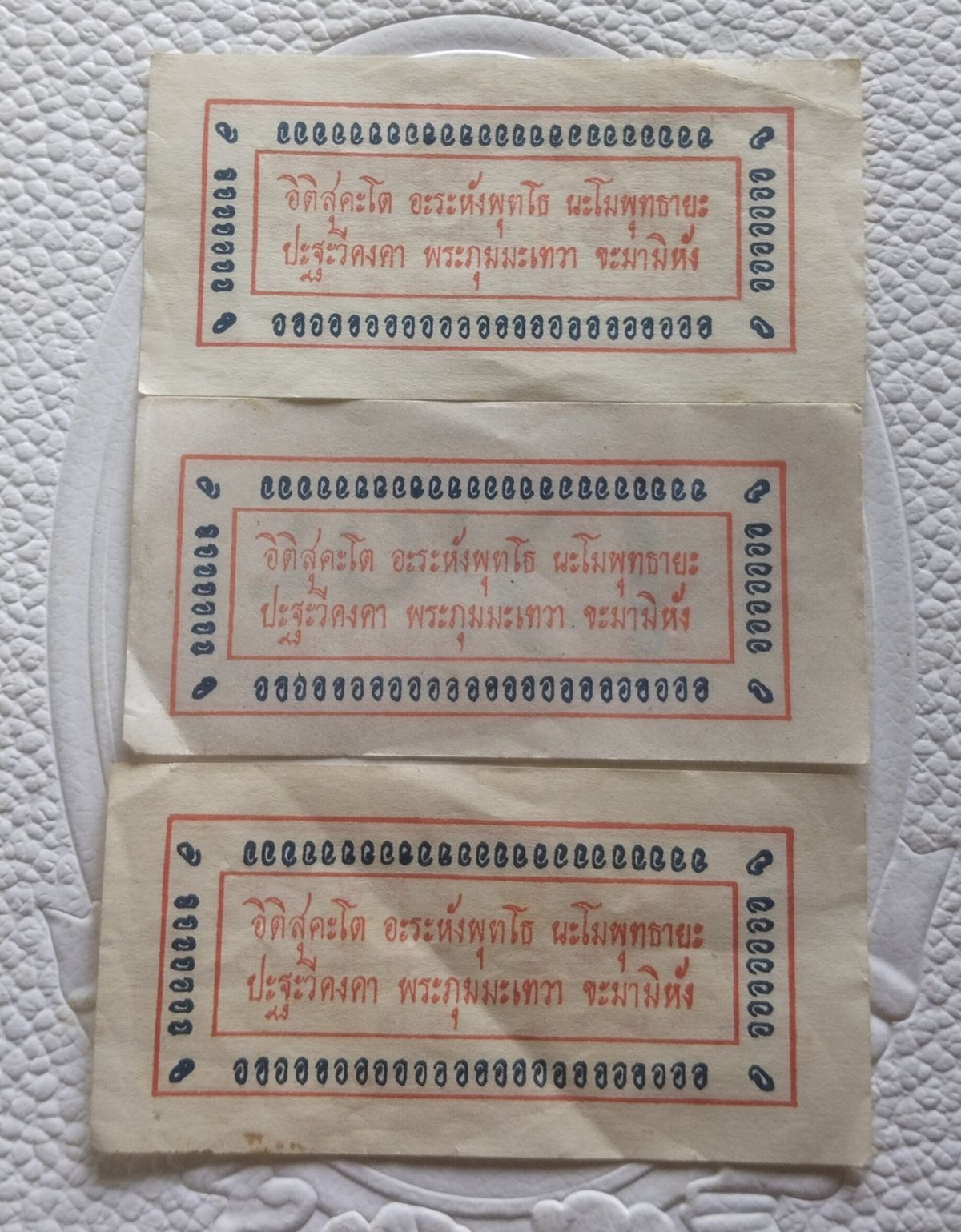 ด้านหน้าเป็นคาถา “อิติสุคะโต อะระหังพุทโธ มะโมพุทธายะ ปะฐะวีคงคง พระภุมมะเทวา ขะมามิหัง” คาถาประจำตัว ด้านหลังมีทั้งภาษาไทย จีน อังกฤษ แขก มอญ(ภาษามอญหายากมาก)