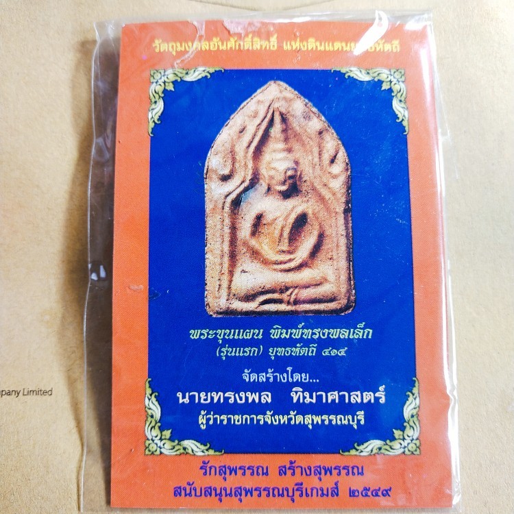 ภาพตามรูปเลยครับ จัดสร้างโดยนายทรงพล ทิมาศาสตร์ผู้ว่าราชการจังหวัดสุพรรณบุรี เมื่อปี 2549 พระรุ่นนี้ผมไปเช่ามาที่วัดป่าเลไลย์สุพรรณบุรีตอนนั้นไปทำบุญครับนานหลายสิบปีแล้ว ถ้าจำไม่ผิดเช่ามาองค์ละ 200.-  น่าจะมีมวลสารของพระขุนแผนผสมอยู่ด้วย