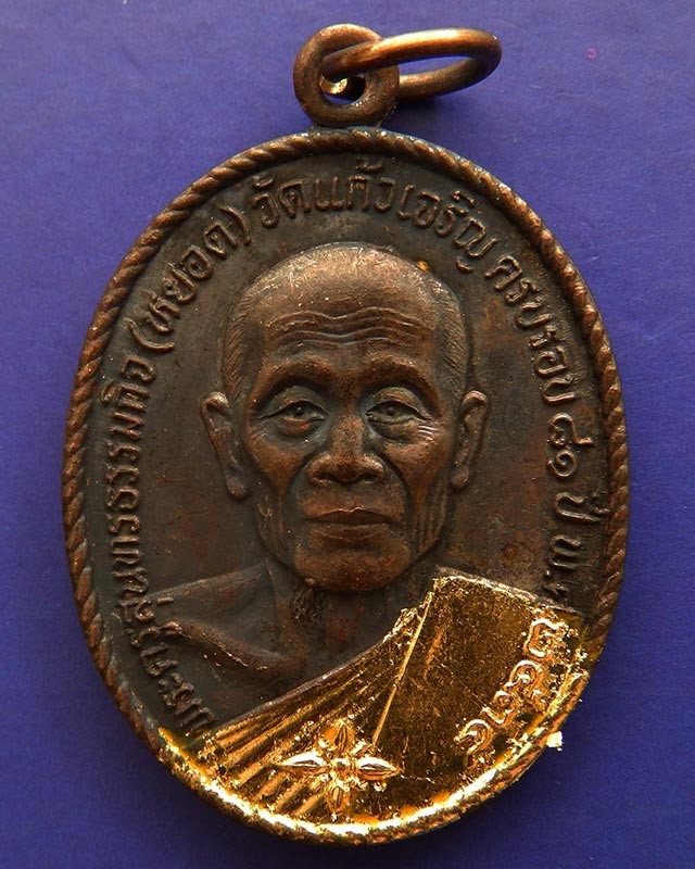 8.หลวงพ่อหยอด วัดแก้วเจริญ เหรียญรุ่นทรัพย์ล้นเหลือ(สไบทอง) ครบ 81 ปี ปิดทองและตอกโค๊ดที่สังฆาฎิ พ.ศ. 2534