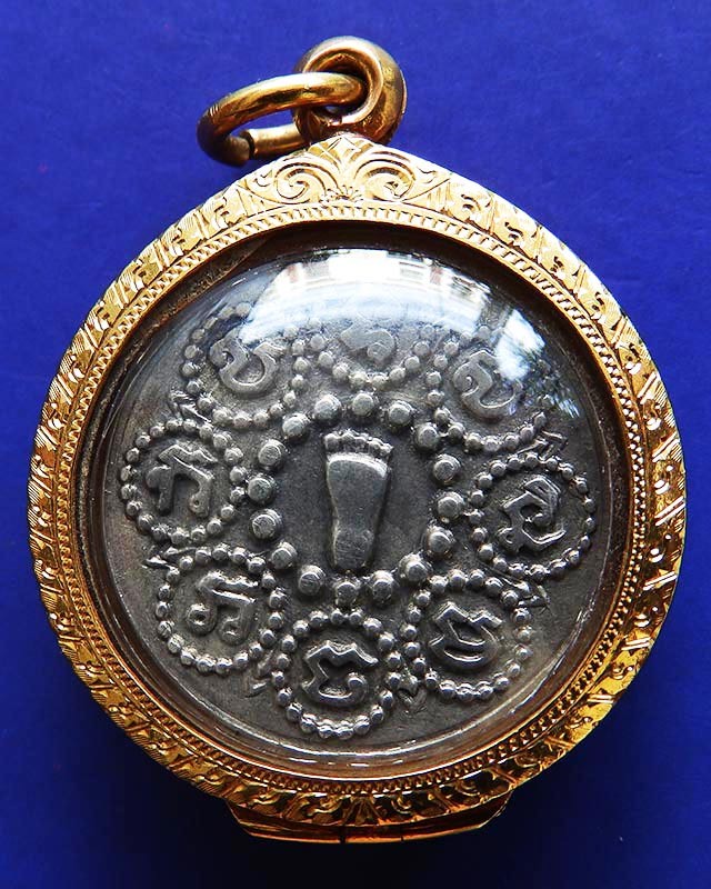 เหรียญรอยพระพุทธบาทเนื้อเงิน สมเด็จพระพุทธโฆษาจารย์ (เจริญ) วัดเขาบางทราย จ.ชลบุรี พ.ศ. 2461 ตลับทองกันน้ำ  น้ำหนัก 9.46 กรัม