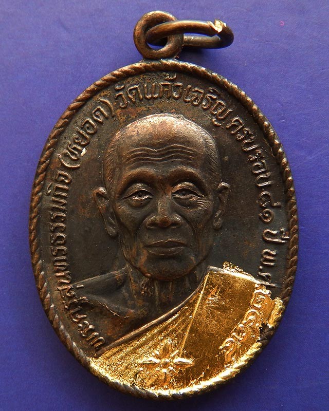 7.หลวงพ่อหยอด วัดแก้วเจริญ เหรียญรุ่นทรัพย์ล้นเหลือ(สไบทอง) ครบ 81 ปี ปิดทองและตอกโค๊ดที่สังฆาฎิ พ.ศ. 2534