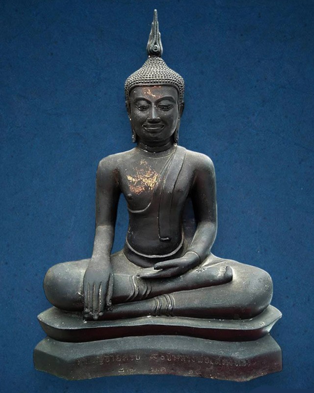 พระบูชาอู่ทอง หน้าตัก 9 นิ้ว (วัดจริง 9.5 นิ้ว) เทดินไทยปิดทับด้วยปูนแล้วประทับตราวัด ฐานด้านหน้าจารงานทำบุญอายุครบ 80 ปี หลวงพ่อเต๋ คงทอง 27 ม.ค. 14
