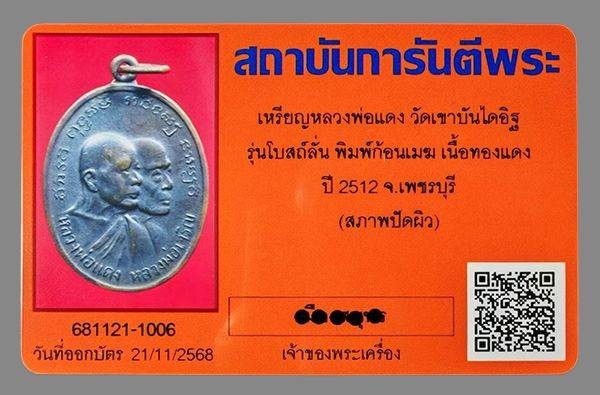 เหรียญหลวงพ่อแดง วัดเขาบันไดอิฐ รุ่นโบสถ์ลั่น พิมพ์ก้อนเมฆ เนื้อทองแดง ปี 2512 จ.เพชรบุรี พร้อมบัตรG....090-9870009
