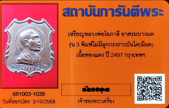 เหรียญหลวงพ่อโอภาสี อาศรมบางมด รุ่น 3 พิมพ์ไม่มีลูกกรงราวบันได(มีผด) เนื้อทองแดง ปี 2497 กรุงเทพฯ พร้อมบัตรG...090-9870009