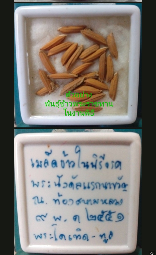 เมล็ดข้าวพระราชทาน ที่นำมาเลี่ยมหลังเหรียญเป็นปี 2551 ซึ่งผมได้ไปร่วมงานตั้งแต่แรกจนจบ เมื่อจบพิธีถึงจะปล่อยให้ประชาชนเข้าเก็บเมล็ดพันธุ์ข้าวพระราช ซึ่งบางคนหาเก็บไม่ได้ต้องยอมซื้อกับพ่อค้า ส่วนผมอยู่รอเก็บข้าวเองกับมือครับ บางเมล็ดต้องคุ้ยทรายลงไปลึกๆ ถึงจะเจอ บางเมล็ดมีรากงอก จะเป็นมงคลมาก ซึ่งหมายถึงเจริญงอกงาม